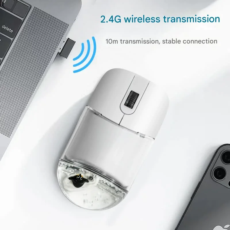 Add a touch of fun and personality to your workspace with this unique 2.4G Wireless Mouse. Featuring an adorable floating animal design within its liquid-filled base, this mouse is both eye-catching and functional. It offers a stable 2.4G wireless transmission with a range of up to 10 meters. Designed for comfort, it has an ergonomic shape that fits well in the palm, a frosted texture for an anti-fingerprint and sweat-resistant grip, and a low-noise operation for a quiet office environment. The oil injection process ensures durability and a lasting playful design. It's a beautiful and practical accessory, perfect as a delightful gift or for adding some cheer to your daily tasks.