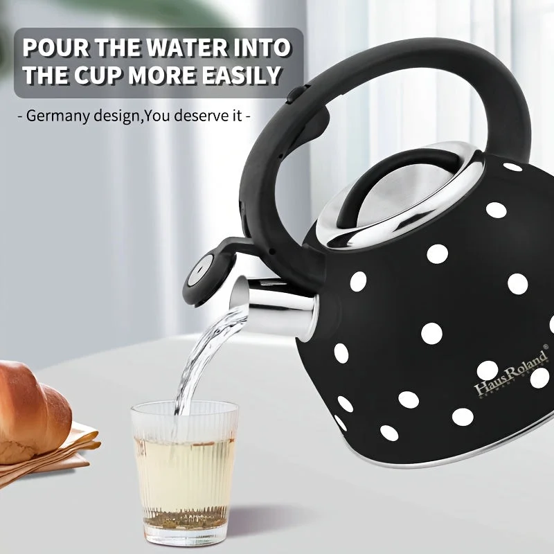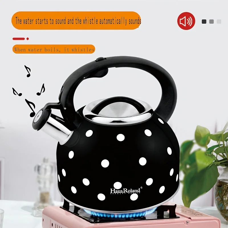 Elegant and efficient — enjoy fast boiling with â€s 2.5L polka dot tea kettle for gas and induction cooktops.