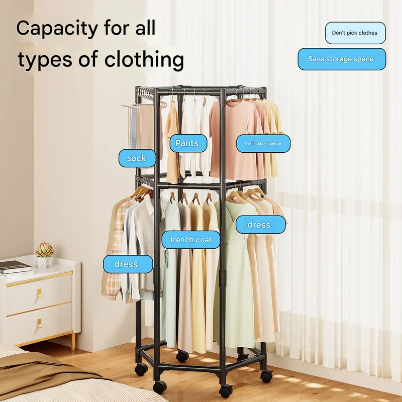 - 360-DEGREE ROTATING HANGING RAIL: The unique hexagonal top rail rotates a full 360 degrees, allowing you to access your clothes from any angle with a simple spin. Effortlessly find the perfect outfit without shuffling through crowded hangers.