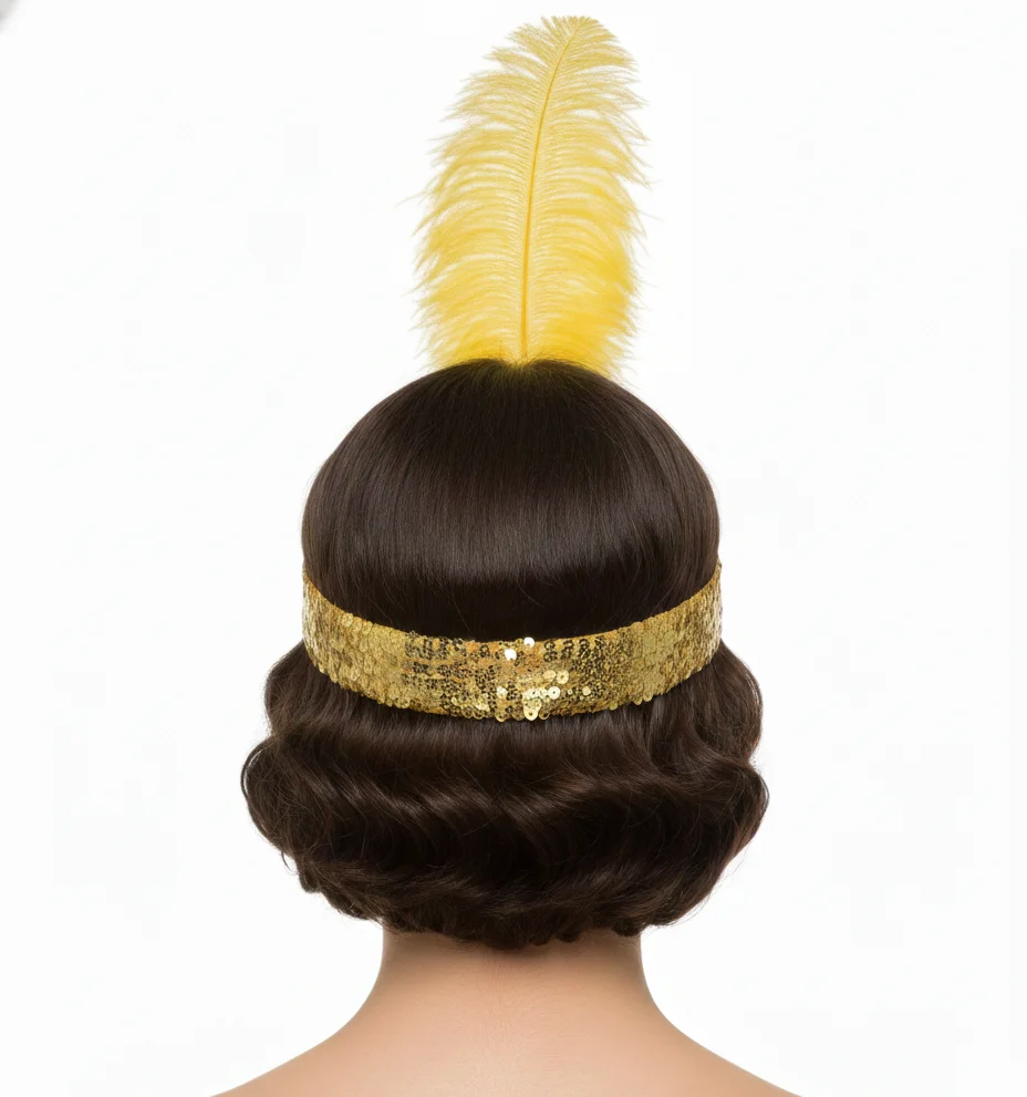 Great fun! Terrific flapper headpieces - featuring a stretch elastic sequin headband, jewel motif and an ostritch feather.