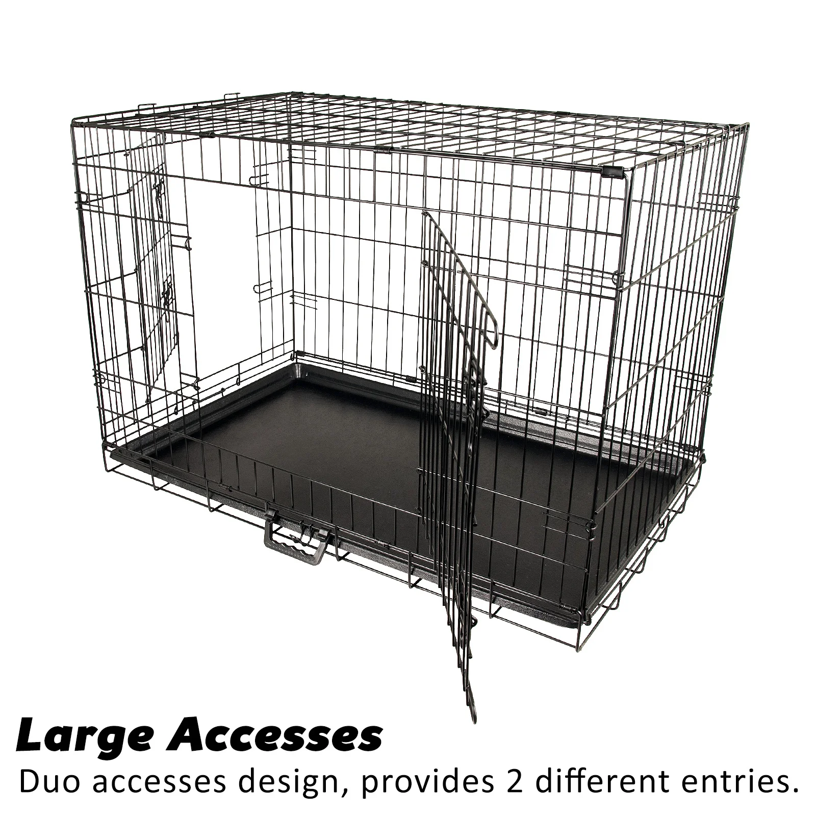 This convenient wire dog crate feature double access doors that provide easy access for your dog to easily enter and exit, as well as dual safety locks on each door to keep your pup securely inside. Built with quality sturdy wire construction with black powder-coated finish. The slide-out / removable plastic tray for easy cleaning.