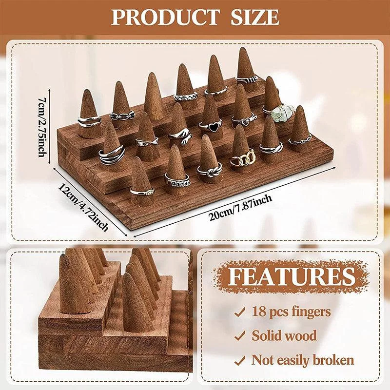 This wooden ring display stand is an elegant and practical solution for showcasing your ring collection. Made from solid beechwood, it features 18 individual slots, offering ample space to display rings of various sizes. Its compact size of 7.87 x 4.72 x 2.75 inches makes it perfect for small spaces such as counters, dresser tops, or shop displays. The natural wood finish adds a touch of sophistication, making it a beautiful addition to any setting, while keeping your rings organised and secure.
