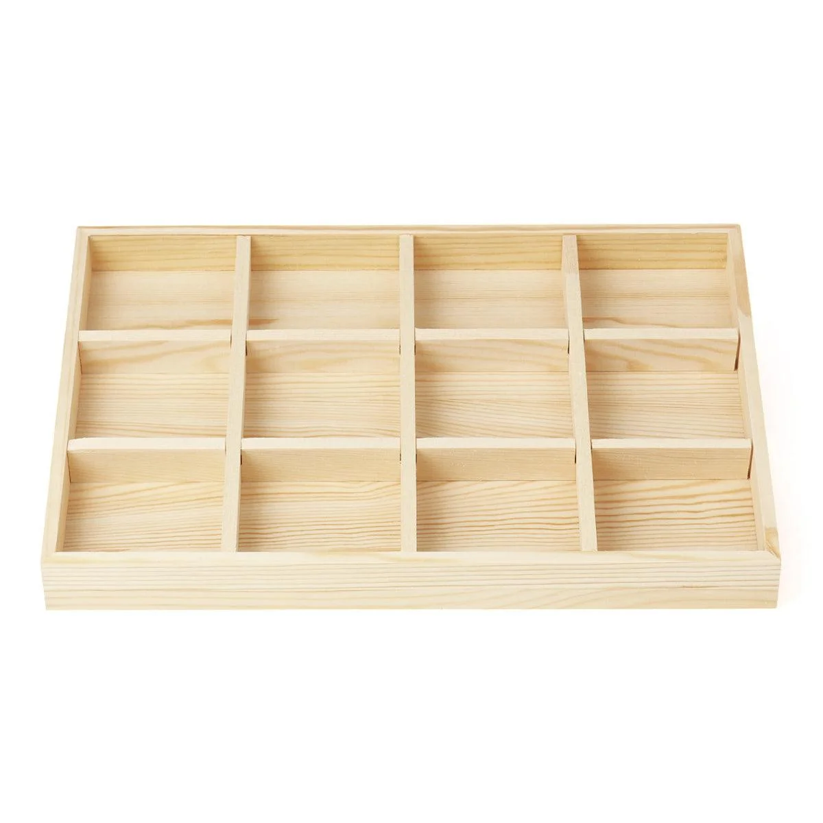 Keep your jewellery neatly organised and elegantly displayed with this wooden organiser tray. Crafted from natural pine wood, this tray is both durable and stylish, making it a perfect addition to your vanity, dresser, or retail counter. Available with either 4 or 12 compartments, it offers ample space for storing rings, bracelets, earrings, and necklaces, allowing you to keep your accessories easily accessible. The minimalist design complements any décor while the smooth, polished edges ensure safe handling.