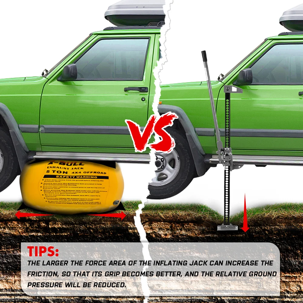 [Unique role]The exhaust jack can be used on hard ground and special terrain such as sand, mud and snow. Air jack can lift up to 5000kg of vehicles, which is equivalent to the weight of a truck. Therefore, the jacks can be applied to most car.