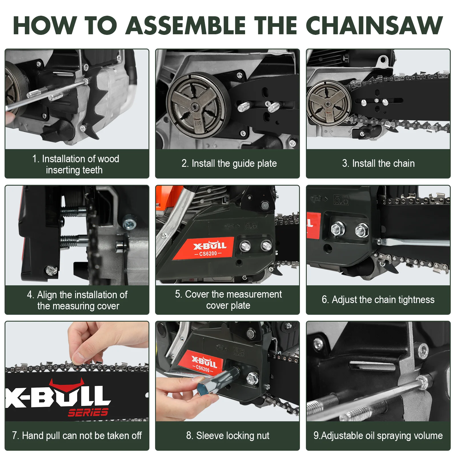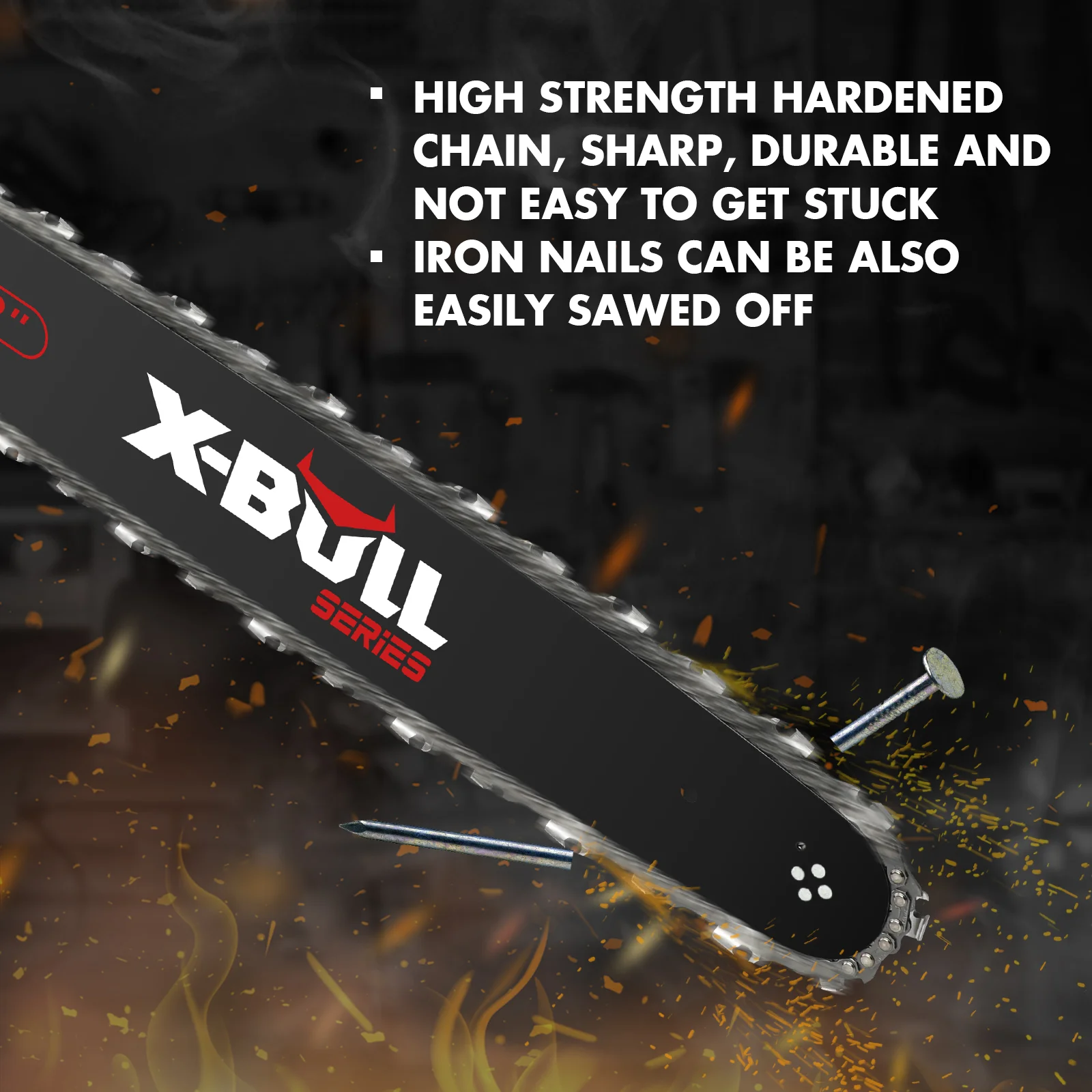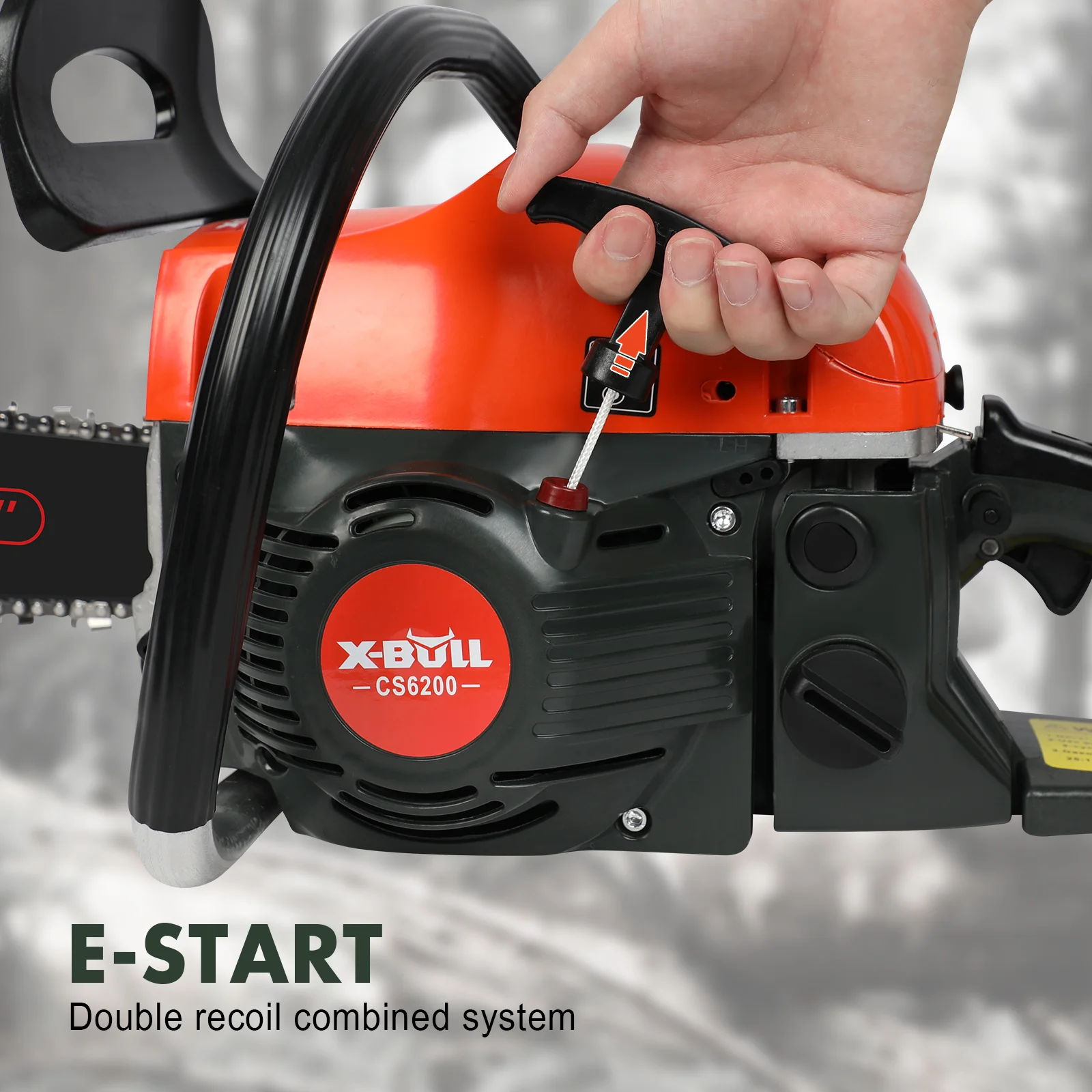 An essential tool of the trade, the X-BULL Series Petrol Chainsaw is a must-have for any tradesperson or gardener, whether you're commercial or home-based. Thanks to its direct air injection carburettor, it is built for high-power, high-speed cutting. It features a balanced design for ease of use and maneuverability, while the built-in anti-vibration system keeps fatigue at bay perfect for those long jobs. It uses a double recoil pulling system for easy start-up, while the adjustable automatic oil feeding system allows you to set and forget your chain lubrication for a smooth cut in any condition. The chainsaw features a quick tension chain mechanism to adjust the chain easily and efficiently, and the integrated chain brake helps to keep you safe. With easy access to the engine, filters and spark plugs, maintenance is easy. Your purchase comes with a bonus saw chain, spark plug, tool set and safety gear, so you'll have everything you need to get started. Trust the pros and add the X-BULL Series Petrol Chainsaw to your collection today.