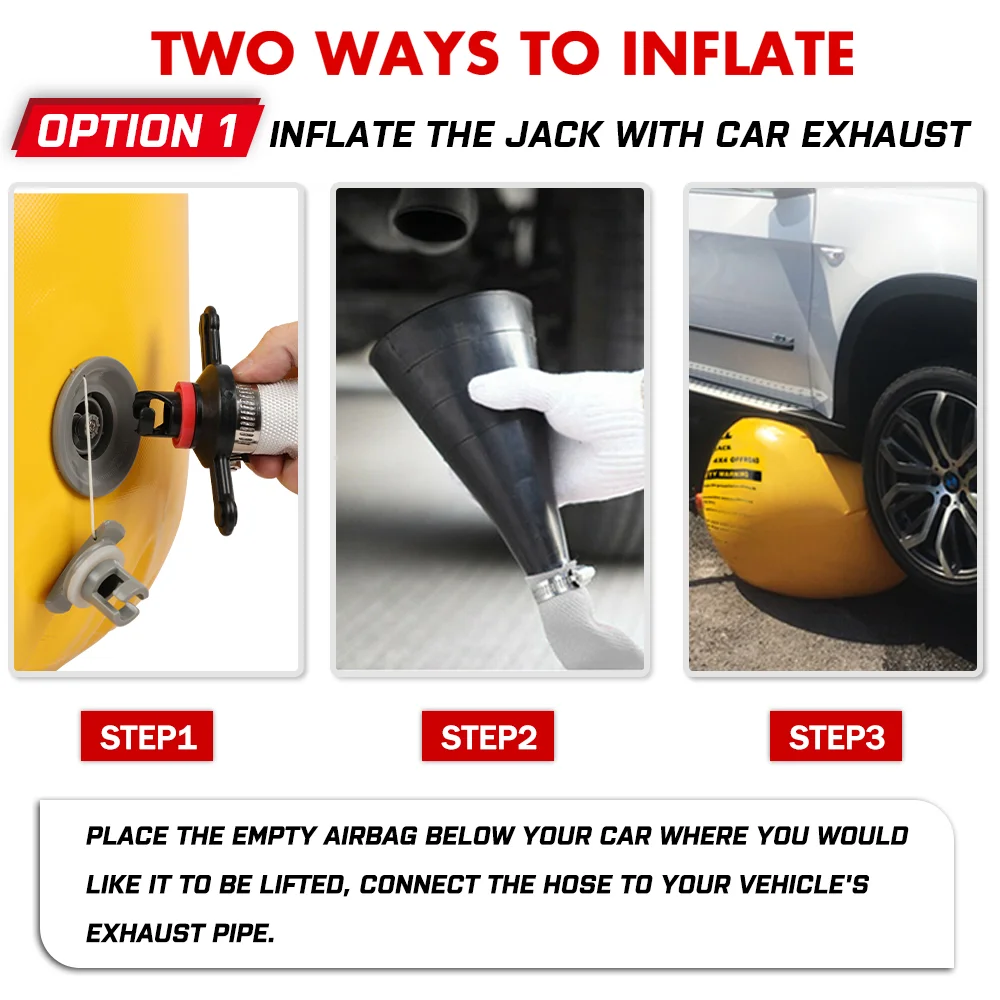 [Unique role] The exhaust jack can be used on hard ground and special terrain such as sand, mud and snow. Air jack can lift up to 5000kg of vehicles, which is equivalent to the weight of a truck. Therefore, the jacks can be applied to most car.