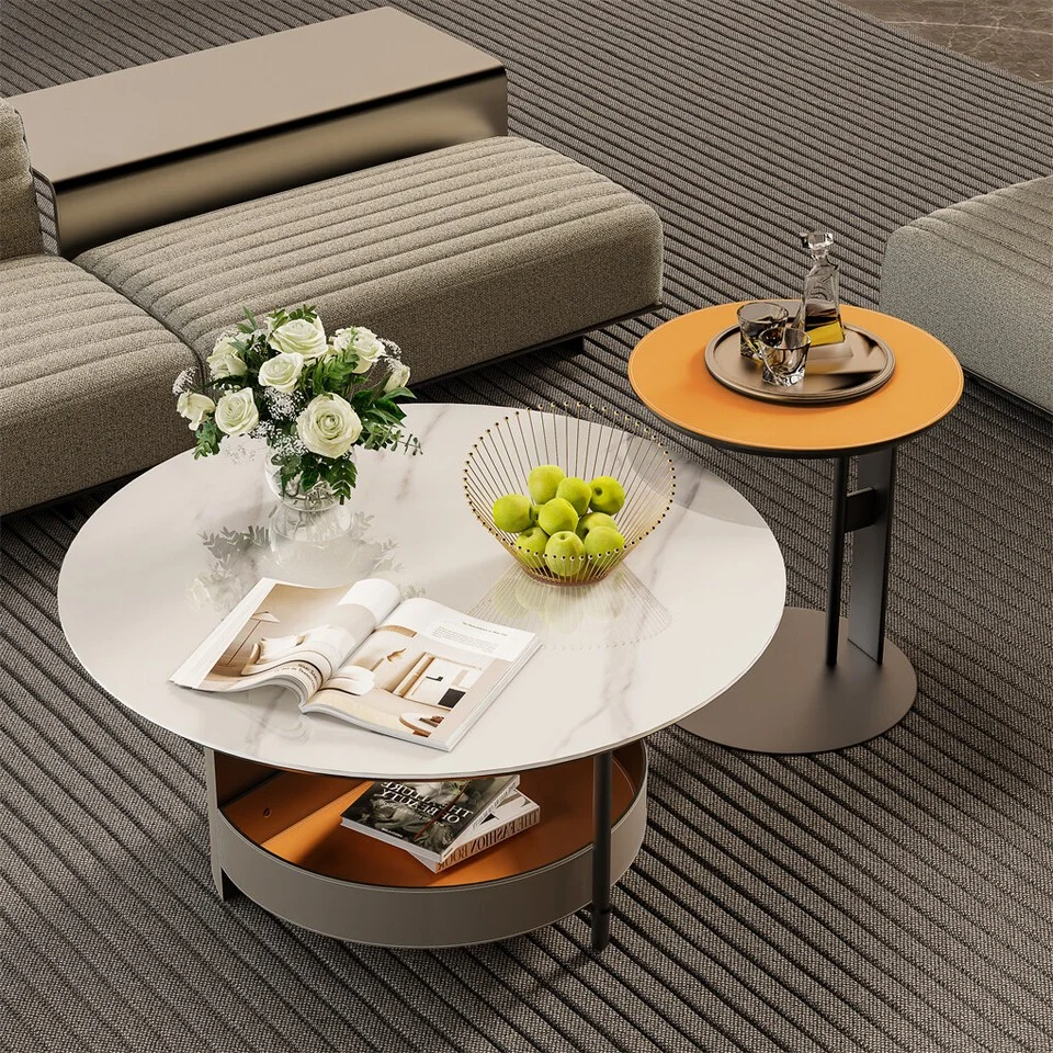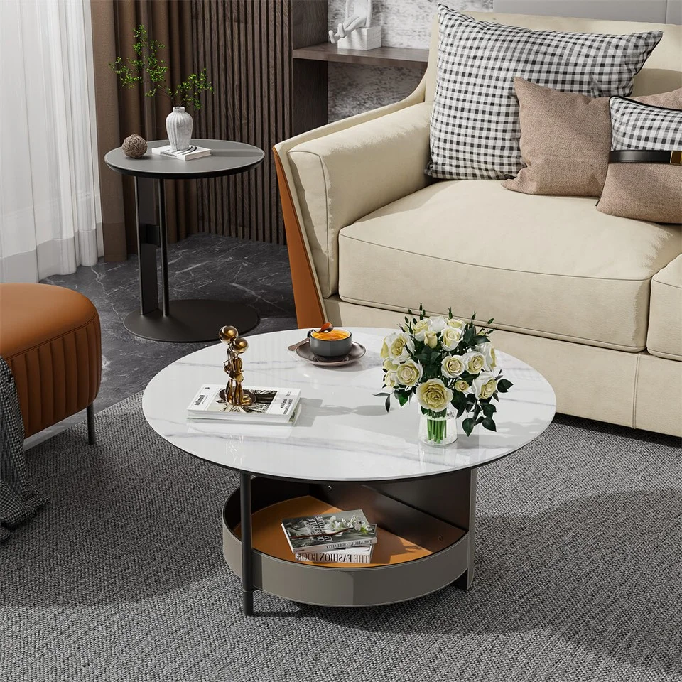 ?Timeless Furniture?This unique center table boasts round circle sintered stone-top and luxurious microfiber saddle leather shelf that offer a clean-lined look, rendered in a pristine white with subtle veining for a sophisticated look, its central placement in the living room draws attention, contributes to create a balanced and harmonious arrangement within space, fits into various interior design styles, from contemporary to classic