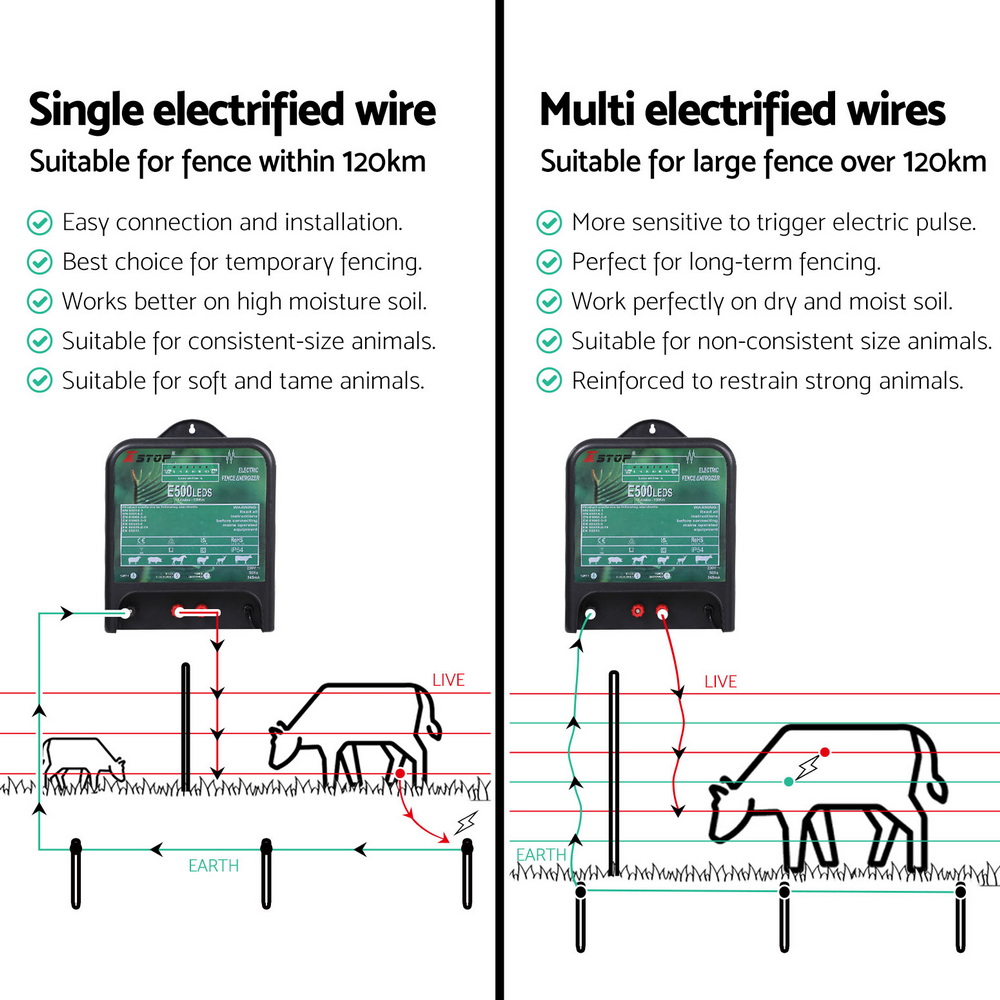 The XSTOP EL500LEDS Electric Fence Energiser designed for mains-powered operation (220V-240V AC), this robust energizer provides effective coverage up to 120km while maintaining energy efficiency at 430mA power consumption. Featuring IP54-rated weather resistance and clear LED status indicators, it ensures reliable performance in diverse conditions. With 5-joule output energy at 500 ohms and compliance with CE/ROHS standards, this unit offers durable protection against livestock breaches. Backed by a 12-month warranty, it’s an ideal choice for farms requiring dependable electric fencing solutions across extensive perimeters.FeaturesUp to 120km effective coverage range220V-240V AC mains power operationIP54 protection ratingClear LED operational status indicatorEnergy-efficient 430mA power consumptionPowerful 7-joule vacuum delivered energy12-month manufacturing defects warrantyCertified compliant with CE & ROHSSuitable for all standard fencing systemsProfessional-grade electric fencing solutionSpecifications:Brand:XSTOPColour: BlackPower Consumption: 430 mA.Delivered Power Vacuum: 7 JoulesPower output at 500 ohms: 5 JoulesEffective Length: Up to 120kmIP Rating: IP54Dimension: 22cm x 9.5cm x 25cmAssembly Required: YesPlease note: This item comes in 1 package. Package ContentXSTOP EL500LEDS Electric Fence Energizer X1User Manual X1This product comes with 1 year warranty