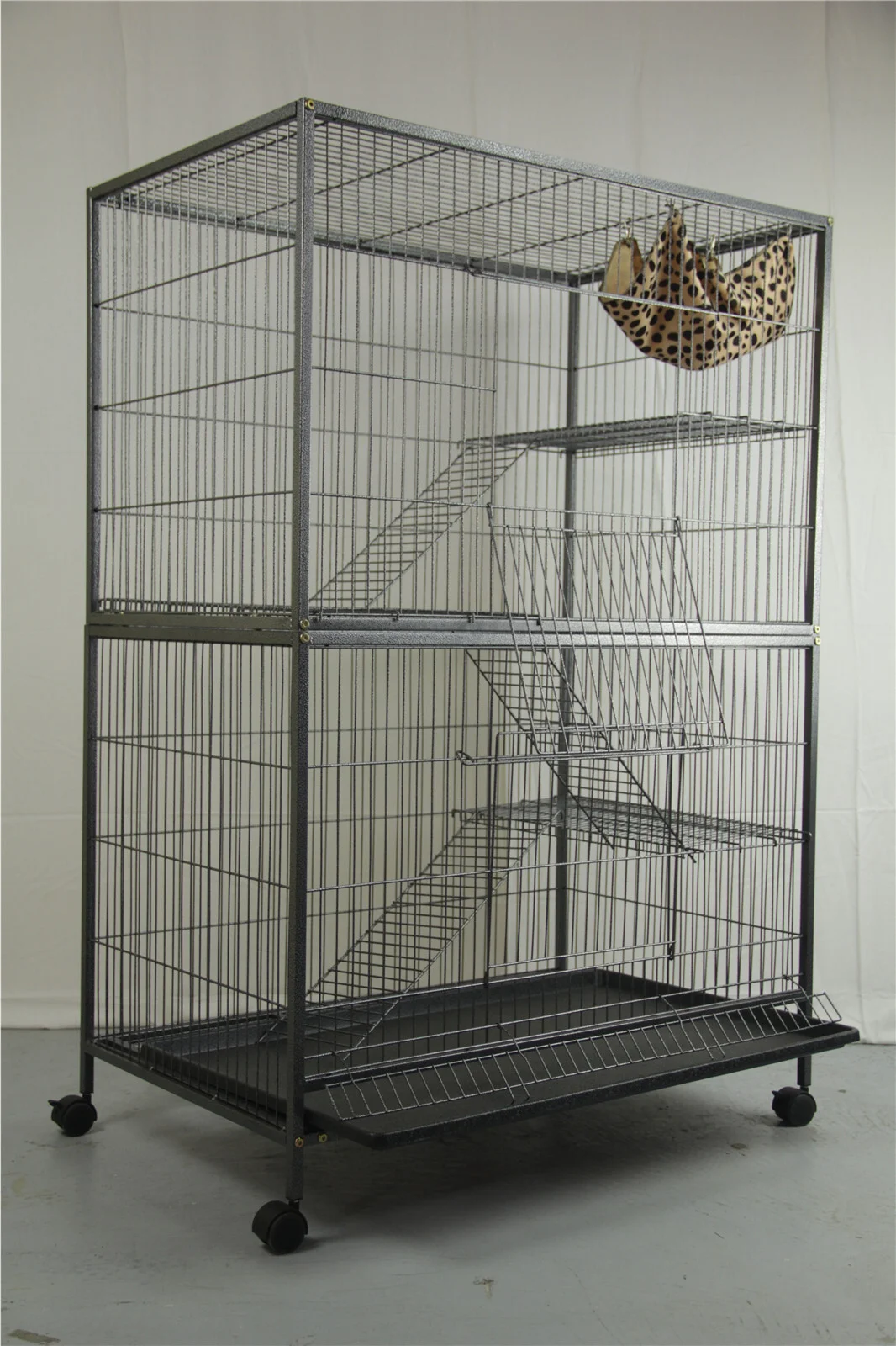 This fantastic, spacious multi-level animal Cage is definitely the most comfortable roost for your little one. Our cage is made of high quality metal with vein powder coating so it is tough and durable. The dimension of this cage is 95 cm x 59 cm x 140 cm, which provides sufficient space and multi-area for your pets. This brand new multi-level ferret cage is in black vein, and 3 removable platforms, 3 removable ladders, and a funky hammock for rest and relaxation. The locks at the bottom of the cage secure animal from being escaped. In this package, it includes 4 smooth castor wheels which provide great mobility.