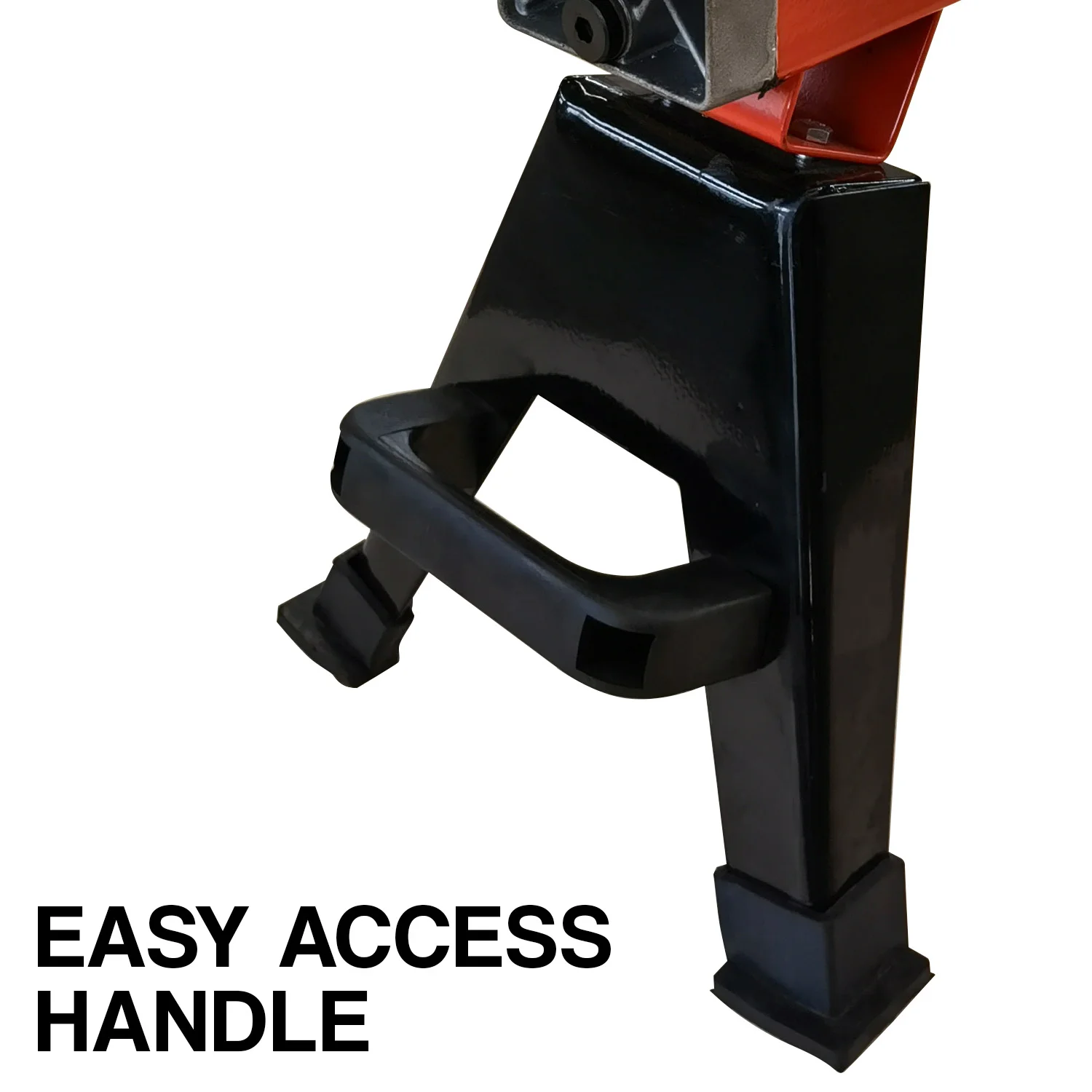 There are two wide-stance front legs for stability and durable six-inch wheels for easy transportation. Simply pick one end up by the handle and the unit tips back onto the wheels. It can even be safely operated on a bench. How's that for flexibility?